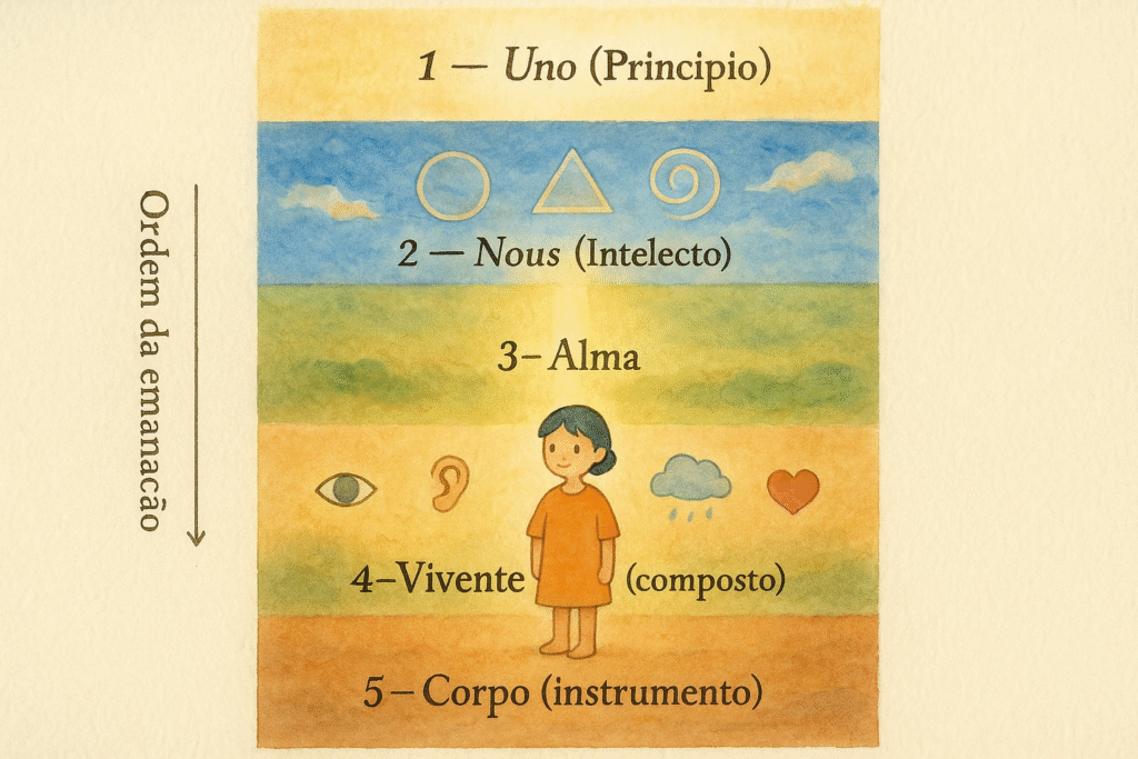 - Ordem: Uno → Nous (Intelecto) → Alma → Vivente → Corpo (hierarquia de causalidade, não cronologia).